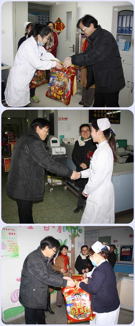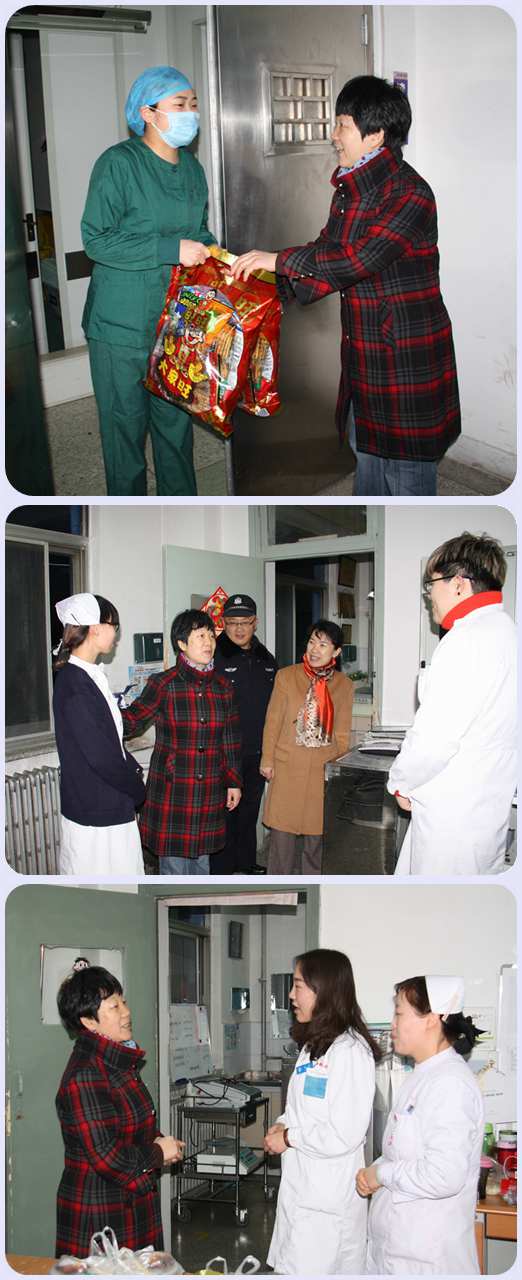 当晚,医院党委书记、工会主席杨毓华及部分院领导一行在工会工作人员及总值班人员的陪同下,带着热腾腾的饺子和节日礼品,走进全院各个病区、医技科室、收费窗口等慰问除夕值班的医护人员,并向大家送上最诚挚的问候和新春祝福。