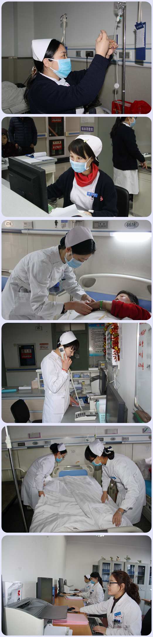 今年的春节长假,医院每天有近50名医护人员坚守岗位。他们放弃与家人团聚,以高度的责任心和饱满的工作热情坚守工作岗位,恪尽职守,确保了医院医疗护理、后勤保障等各项工作的顺利进行,使广大职工群众度过了一个平安祥和的新春佳节。