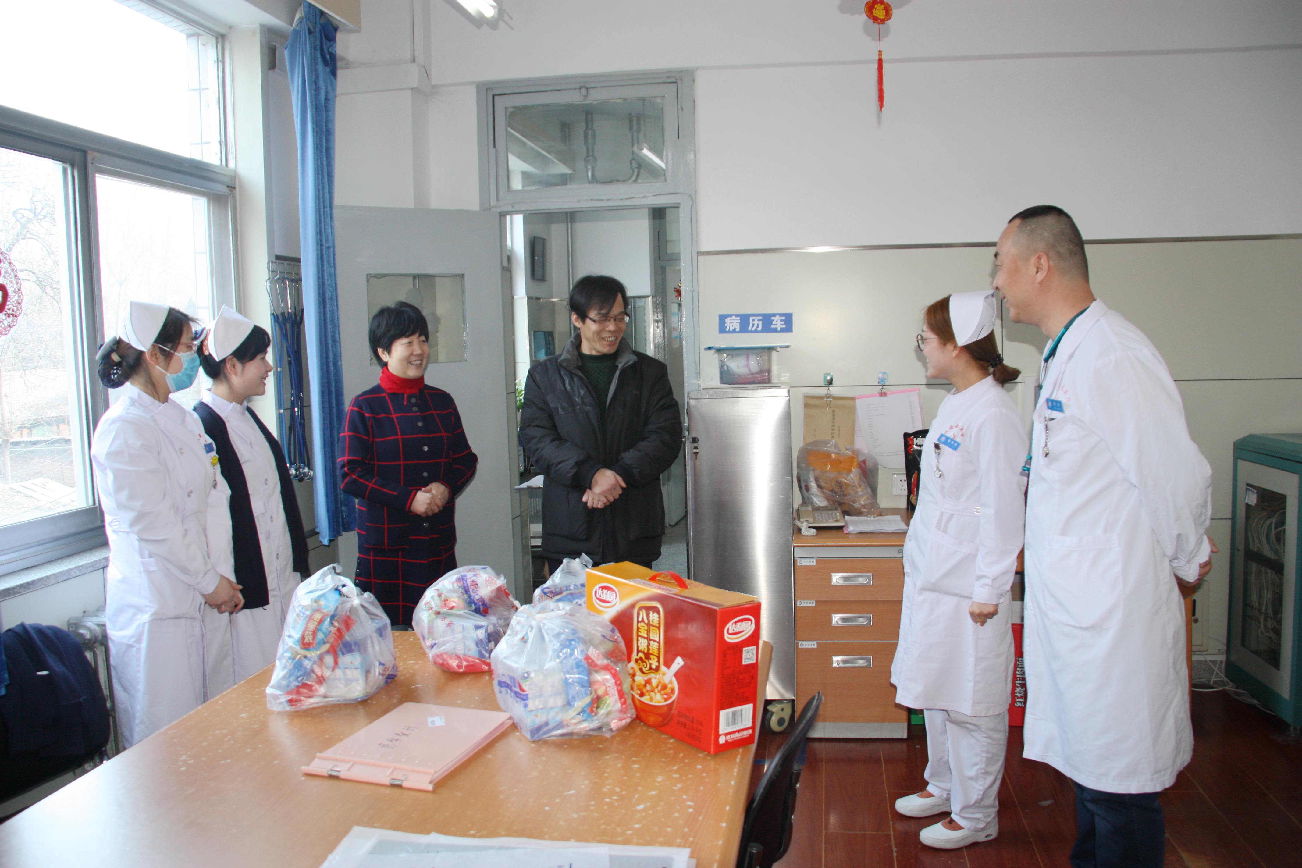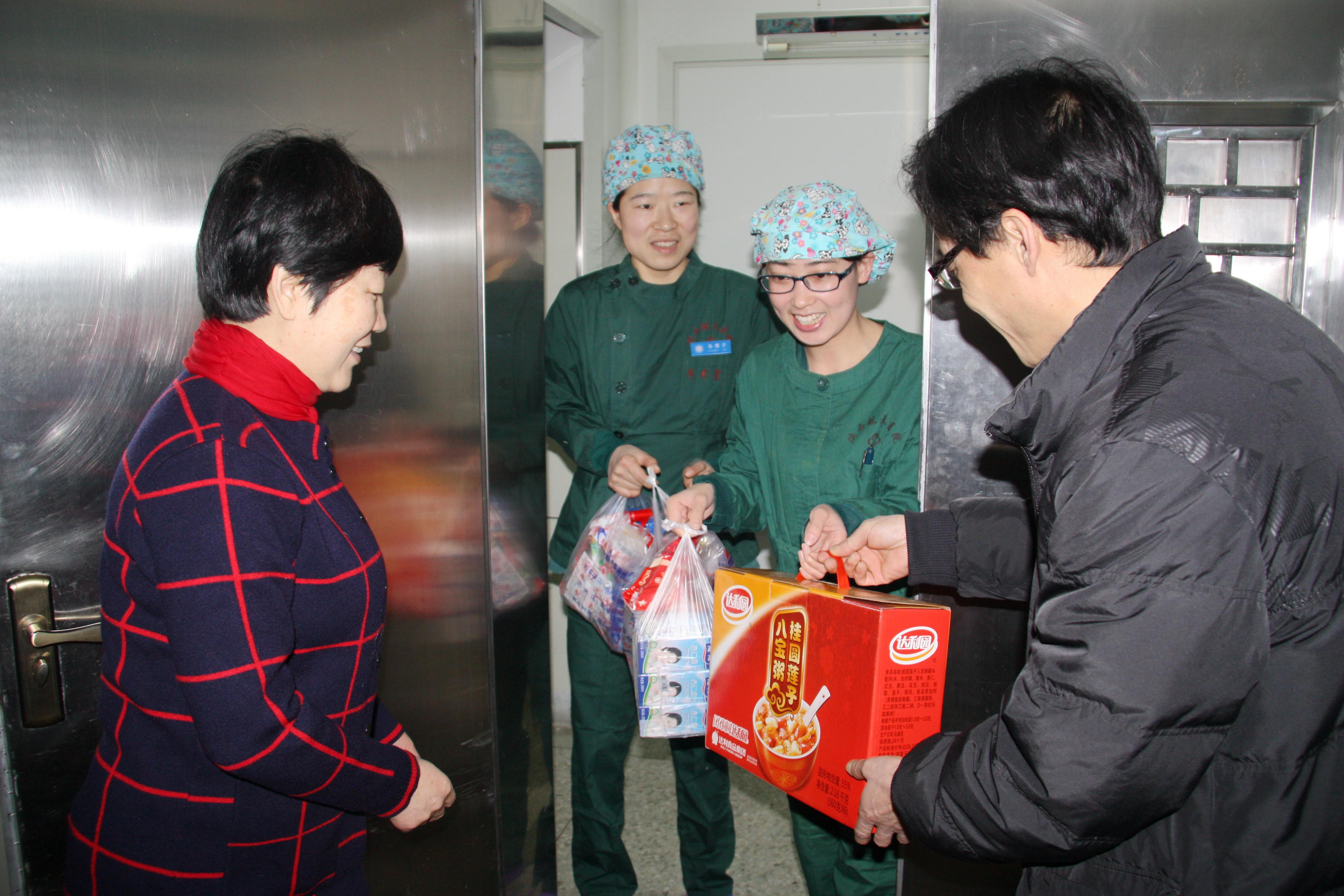 作者: 发布时间:2018-02-15除夕一早,冯忠旗院长、杨毓华书记及工会工作人员、总值班人员一行深入全院各科室、部门,亲切看望节日期间在岗值班的医务人员。“春节快乐!大家辛苦了!”院领导向大家致以新春佳节的美好祝愿,并送上了精心准备的慰问品。
